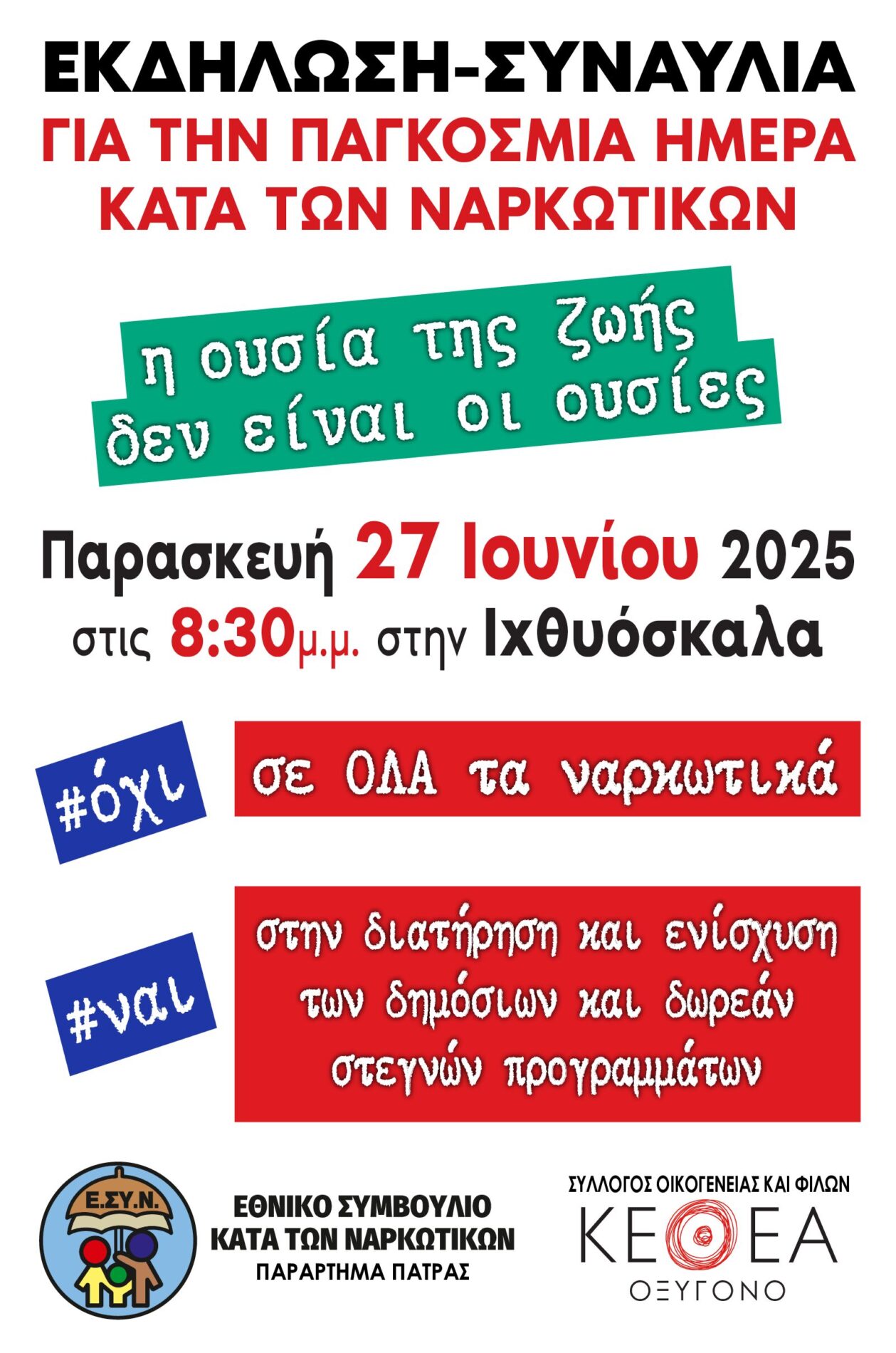 Το ΕΣΥΝ Πάτρας οργανώνει εκδηλώσεις για την Παγκόσμια Ημέρα κατά των ναρκωτικών στο ΧΩΡΟ ΠΟΛΙΤΙΣΜΟΥ «ΙΧΘΥΟΣΚΑΛΑ» την ΠΑΡΑΣΚΕΥΗ 27 ΙΟΥΝΙΟΥ 8:30 μ.μ.