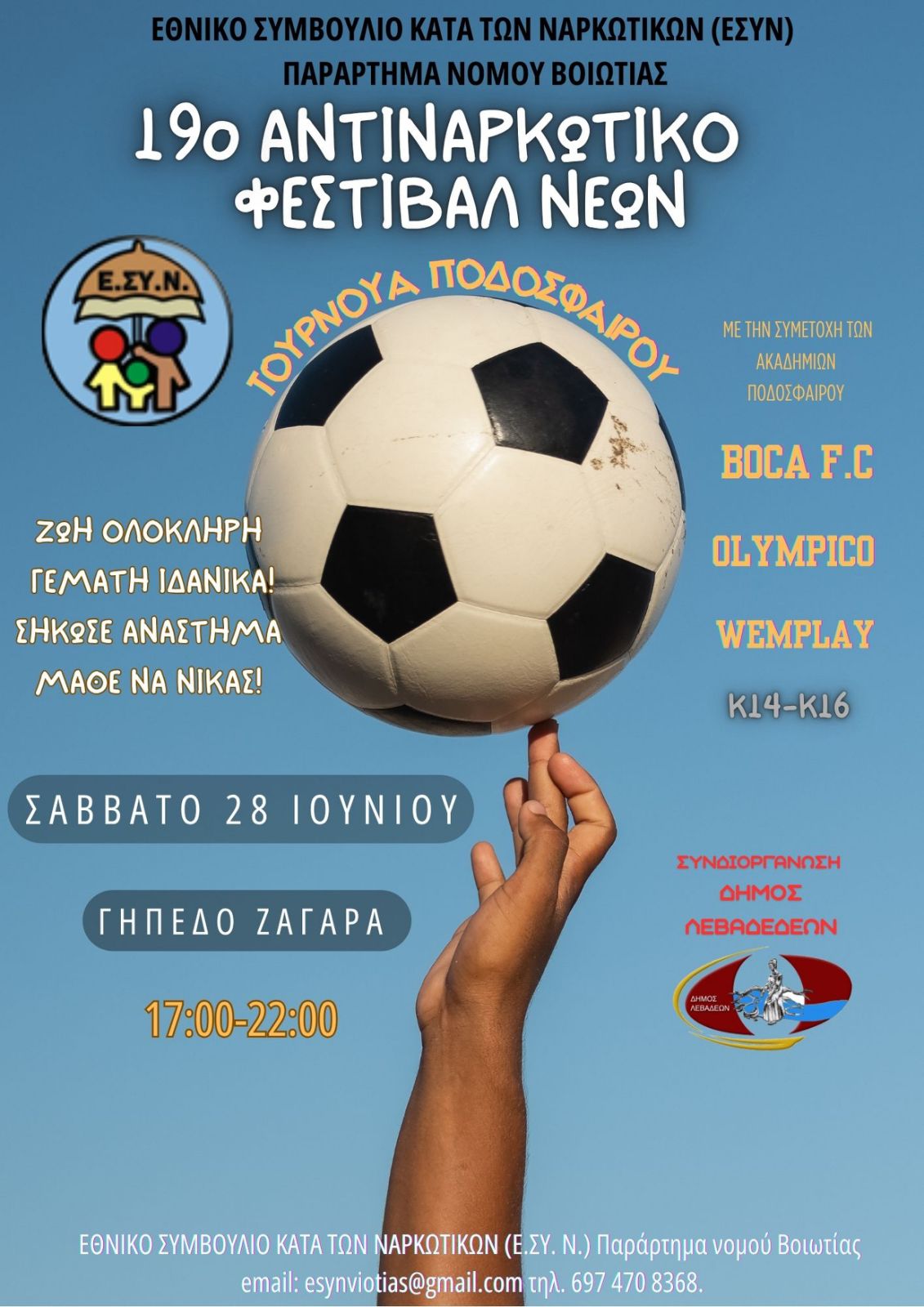 Το παράρτημα Βοιωτίας του Εθνικού Συμβουλίου κατά των Ναρκωτικών (ΕΣΥΝ), με αφορμή την Παγκόσμια Ημέρα κατά των Ναρκωτικών διοργανώνει το 19ο Αντιναρκωτικό Φεστιβάλ Νέων με τουρνουά ποδοσφαίρου στο γήπεδο του Ζαγαρά, το Σάββατο 28 Ιουνίου, ώρες 17.00-22.00 και σε συνεργασία με τα αθλητικά κέντρα ποδοσφαίρου της Λιβαδειάς.