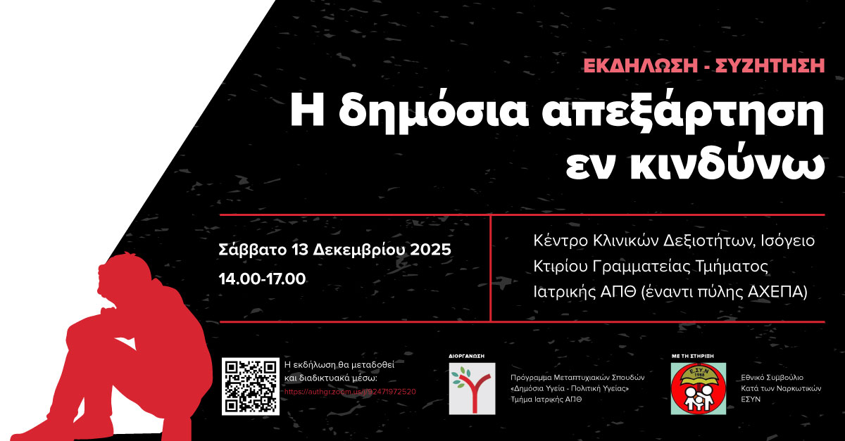Το Πρόγραμμα Μεταπτυχιακών Σπουδών «Δημόσια Υγεία – Πολιτική Υγείας» του Τμήματος Ιατρικής ΑΠΘ με τη στήριξη του Εθνικού Συμβουλίου κατά των Ναρκωτικών – ΕΣΥΝ διοργανώνουν εκδήλωση – συζήτηση